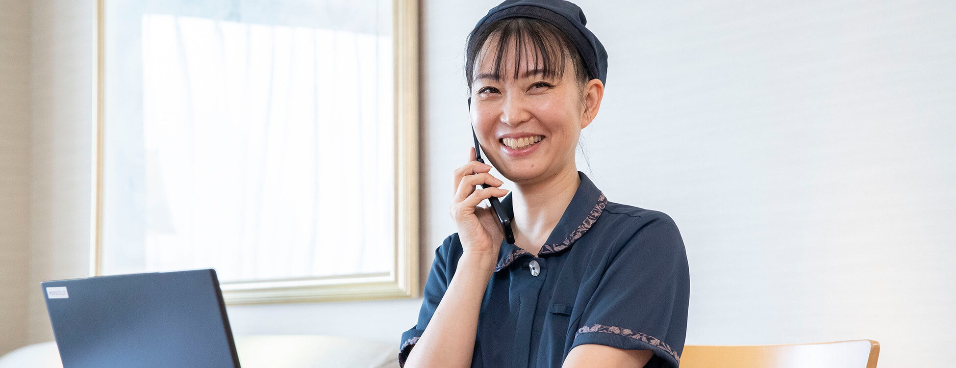 入社後は経験の有無に関わらず、まずはベッドメイク研修からスタート。清掃の基礎をしっかり身につけていただくため、約3ヶ月の研修期間を設けています。時間をかけて業務を覚えられる体制が整っており、未経験からでも安心して働くことができます。